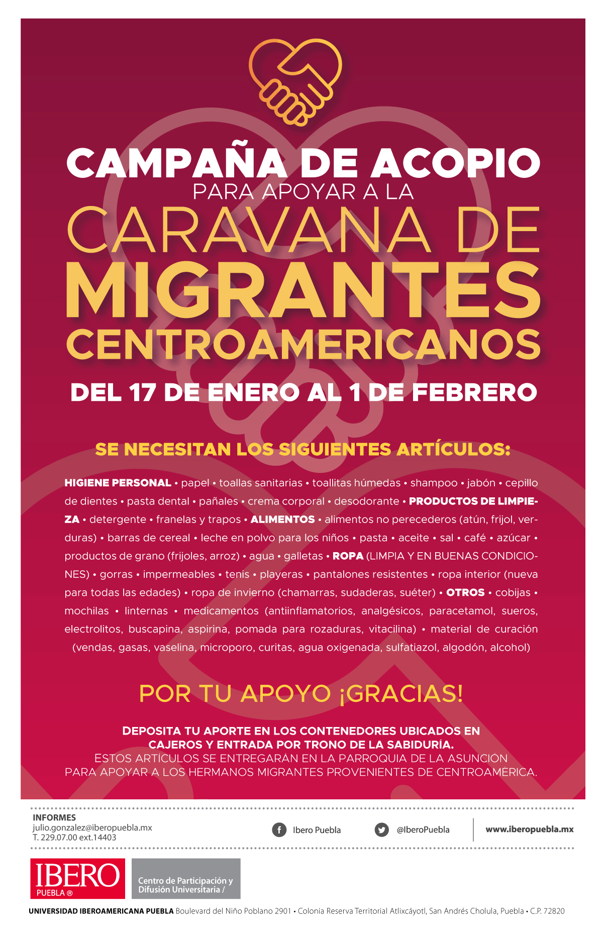 Ante la llegada de la segunda Caravana de Migrantes a Puebla, programada para los últimos días de enero, la Ibero Puebla comenzó una colecta de víveres como respuesta ante la tortuosa situación.