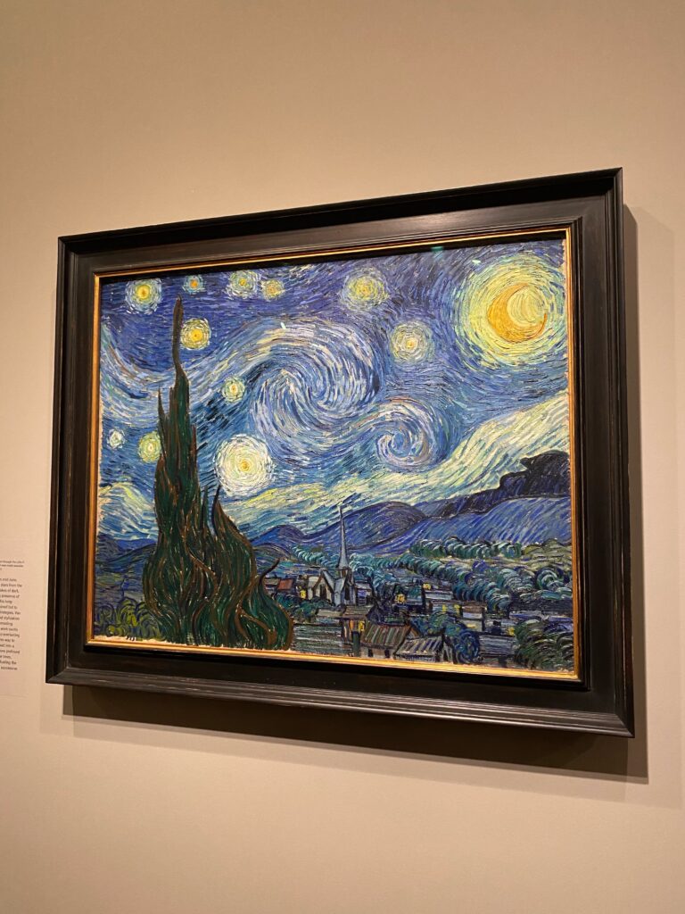 Tuve la fortuna de ver el cuadro en persona durante mi visita al MoMA. Siempre lo había imaginado enorme, pero en realidad mide apenas 73.7 por 92.1 cm. Su fuerza no está en el tamaño, sino en la manera en que atrapa la mirada. Estar frente a él me hizo sentir que por un momento estaba más cerca de Van Gogh, de su lucha y de su sensibilidad. Tomé una fotografía con mi celular, pero comprendí enseguida que ninguna imagen puede transmitir lo que significa estar ahí, frente al lienzo original.