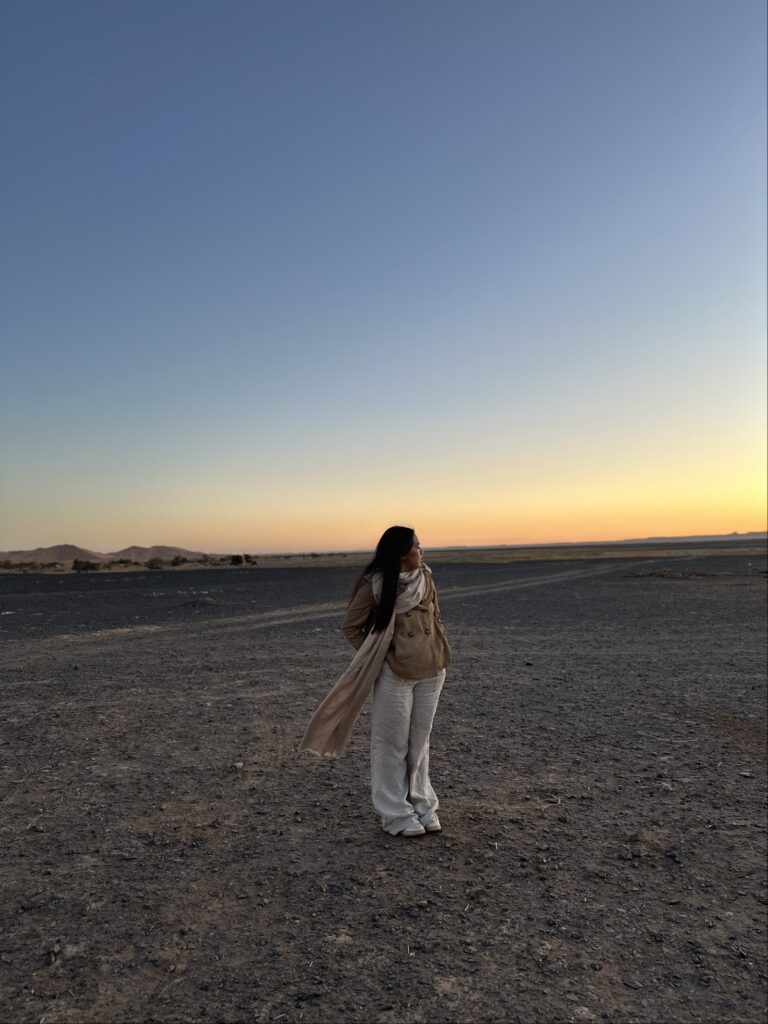 Recuerdo que uno de los momentos más bonitos de mi viaje fue cuando nos llevaron a lo alto del Sahara a ver cómo la noche se escondía y el amanecer cubría de luz el cielo, ese fue mi momento favorito. Cuando regresé de Marruecos, volví con una nueva sensibilidad hacia la diversidad cultural. A pesar de las dificultades que tuve en este viaje, compartí con mis amigos mi experiencia y claro que no es lo mismo pensarlo que vivirlo, y me di cuenta de que este viaje me dio la oportunidad de valorar las bendiciones que me da la vida, Dios y el universo al permitirme experimentarlas.