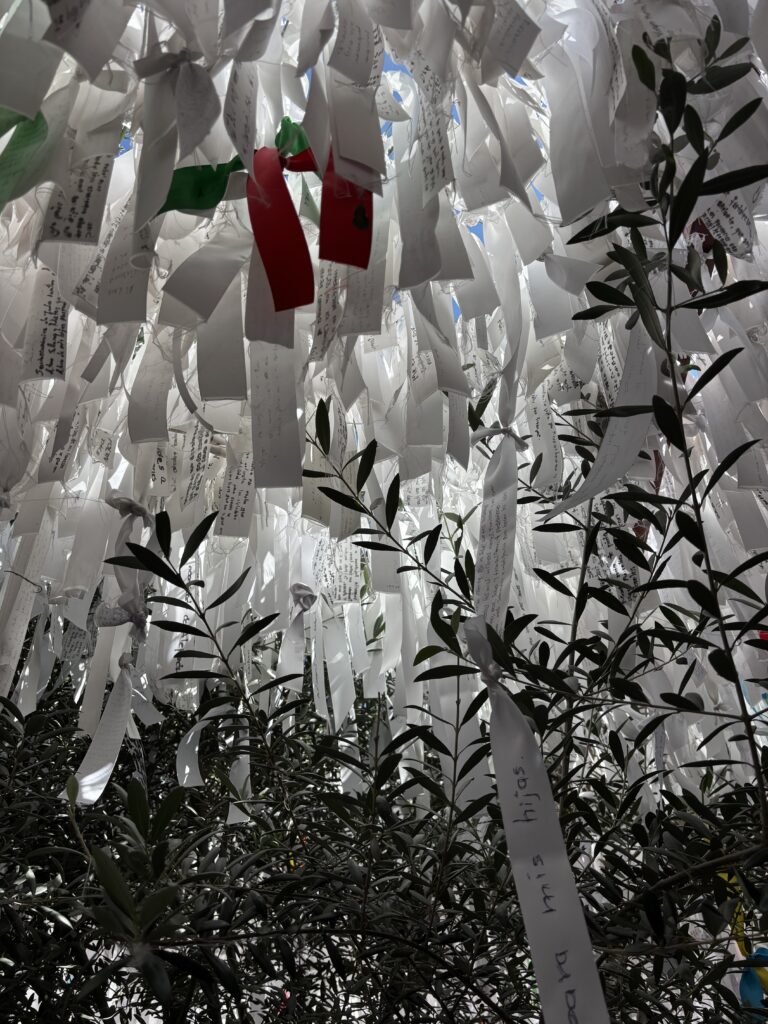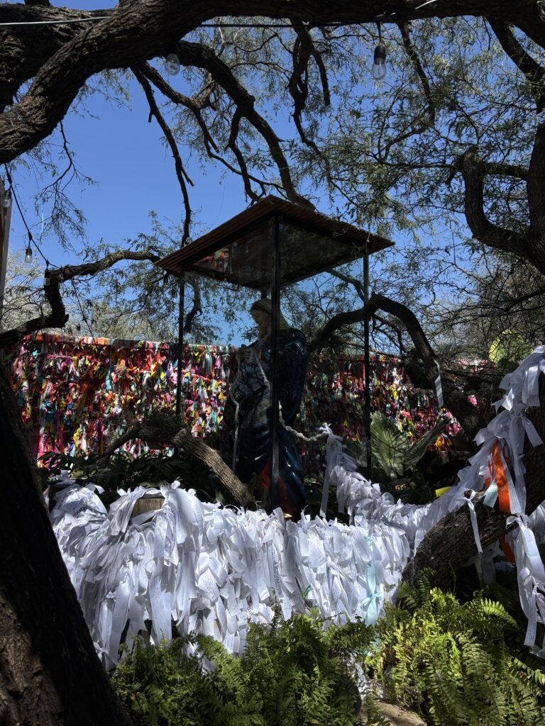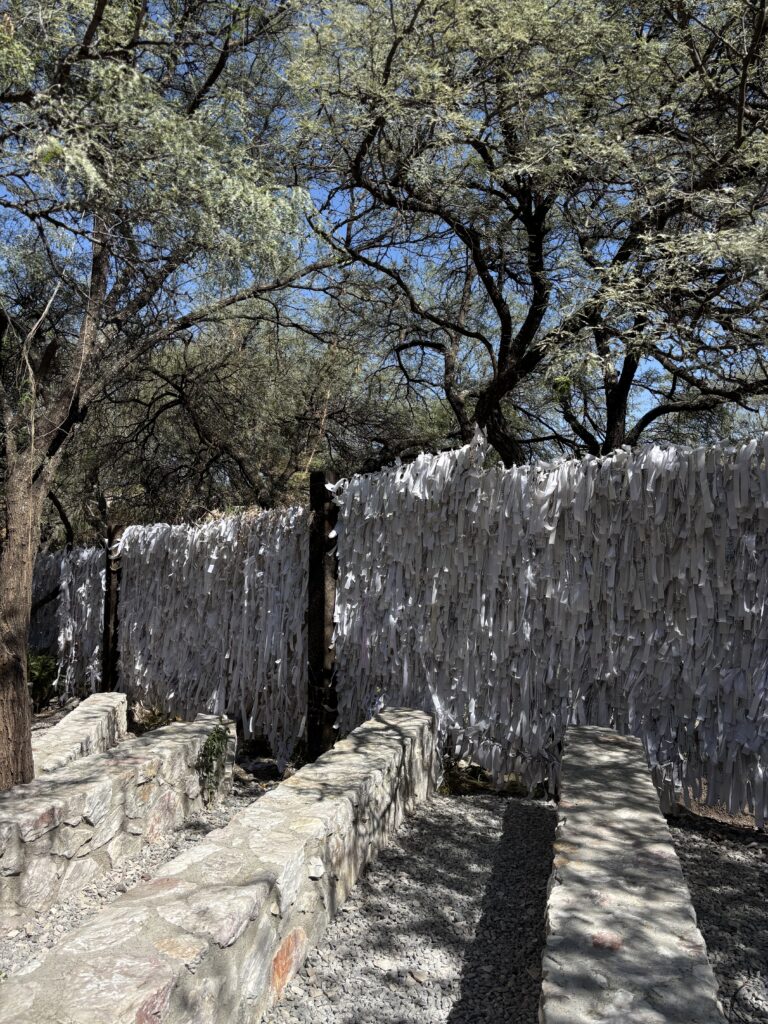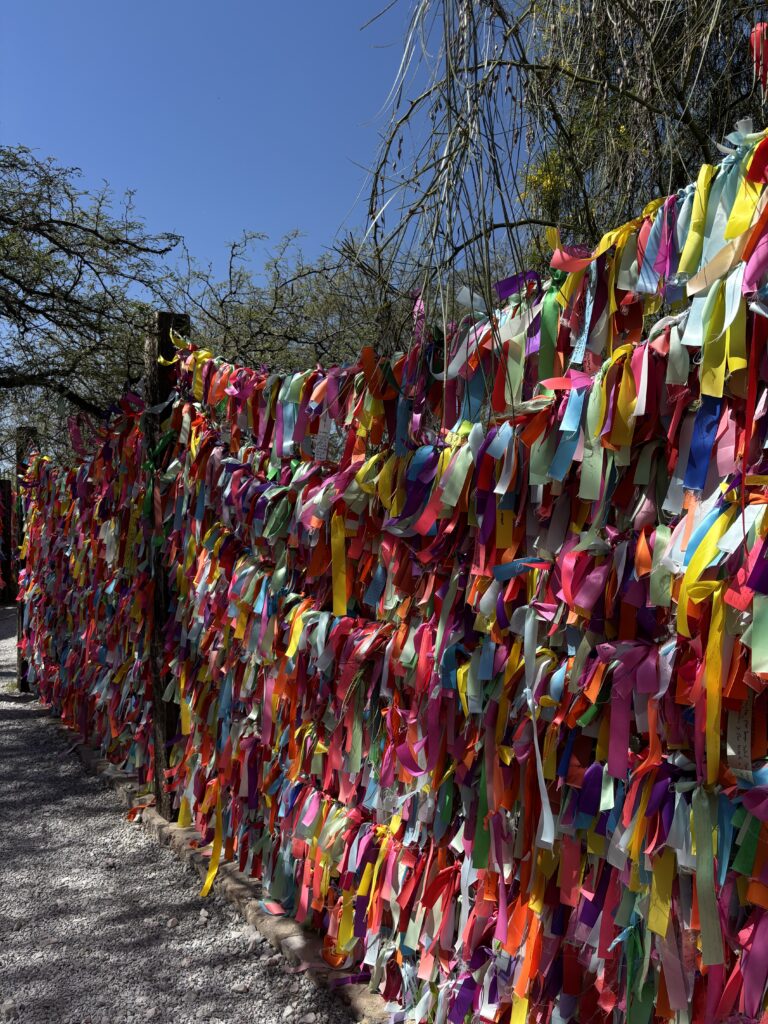 Una de las experiencias más significativas de mi visita fue escribir mi propio listón y amarrarlo. En el santuario no se venden cintas; cada persona toma la que necesita y, si quiere, deja un donativo. Ese gesto, sencillo, pero honesto, hace que escribir el listón se vuelva un acto personal. Tomarlo en las manos, pensar qué decir, elegir el lugar donde amarrarlo y finalmente dejarlo ahí crea un momento íntimo, de pausa y reflexión.