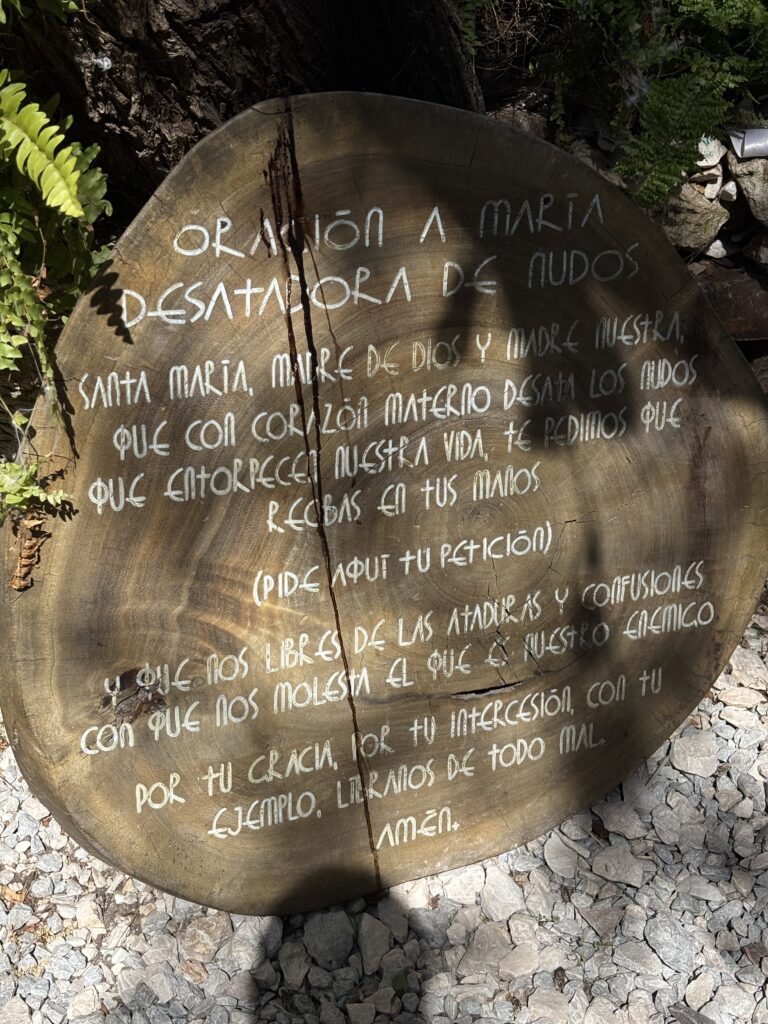El recorrido inicia por un camino de piedra que conduce hasta el fondo del santuario, donde se encuentra la imagen de la Virgen. Su figura está protegida por un pequeño techo y un cubo de vidrio que deja entrar la luz mientras la resguarda del clima. En sus manos sostiene una cuerda gruesa, apretada y llena de nudos reales. No son adornos ni elementos decorativos: cada nudo fue atado por una persona distinta, cada uno representa una preocupación, un problema o un conflicto que pide ser desatado. Verla así, con la cuerda ya marcada por tantas manos, produce un efecto difícil de describir. No se siente tristeza ni pesadez, sino un tipo de impacto silencioso, como si uno estuviera frente a una colección física de historias humanas.